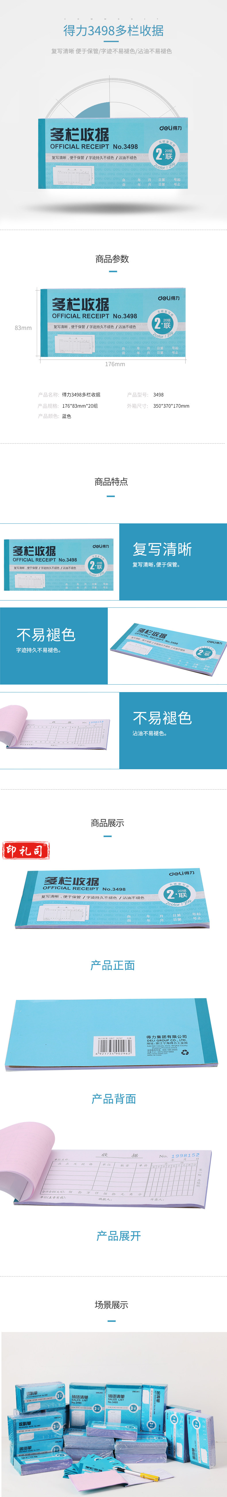 得力 收据 无碳复写二联多栏收据 单据 10本/包 单本价格 3498
