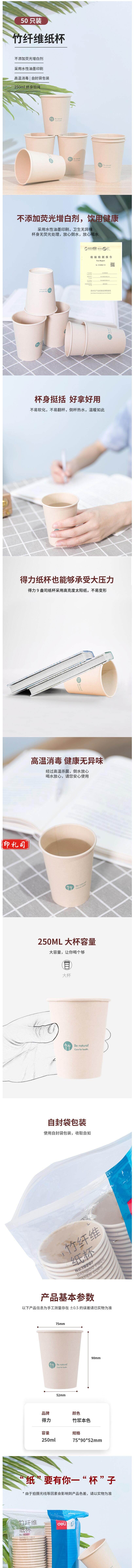 得力(deli)250m一次性纸杯 竹纤维本色纸杯子/水杯 加厚隔热 50只装 19207