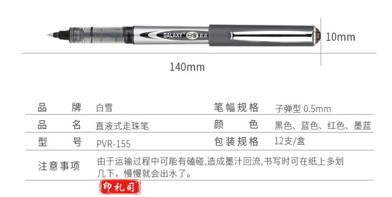 白雪 PVR-155 中性笔 黑色走珠笔0.5直液式 12支装(盒)