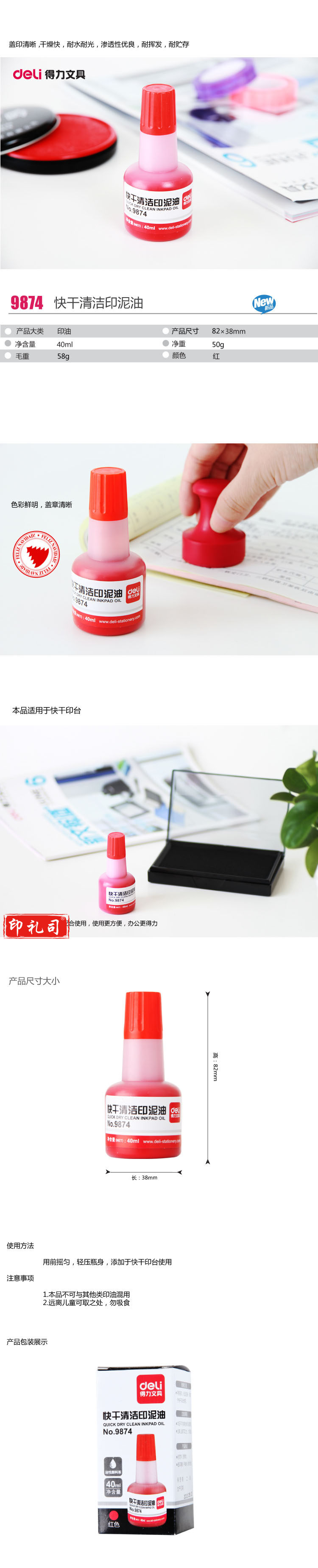 得力9874快干秒干印台 红色印油 橡皮章印泥 财务专用印油 红色快干印油 净含量 40ML