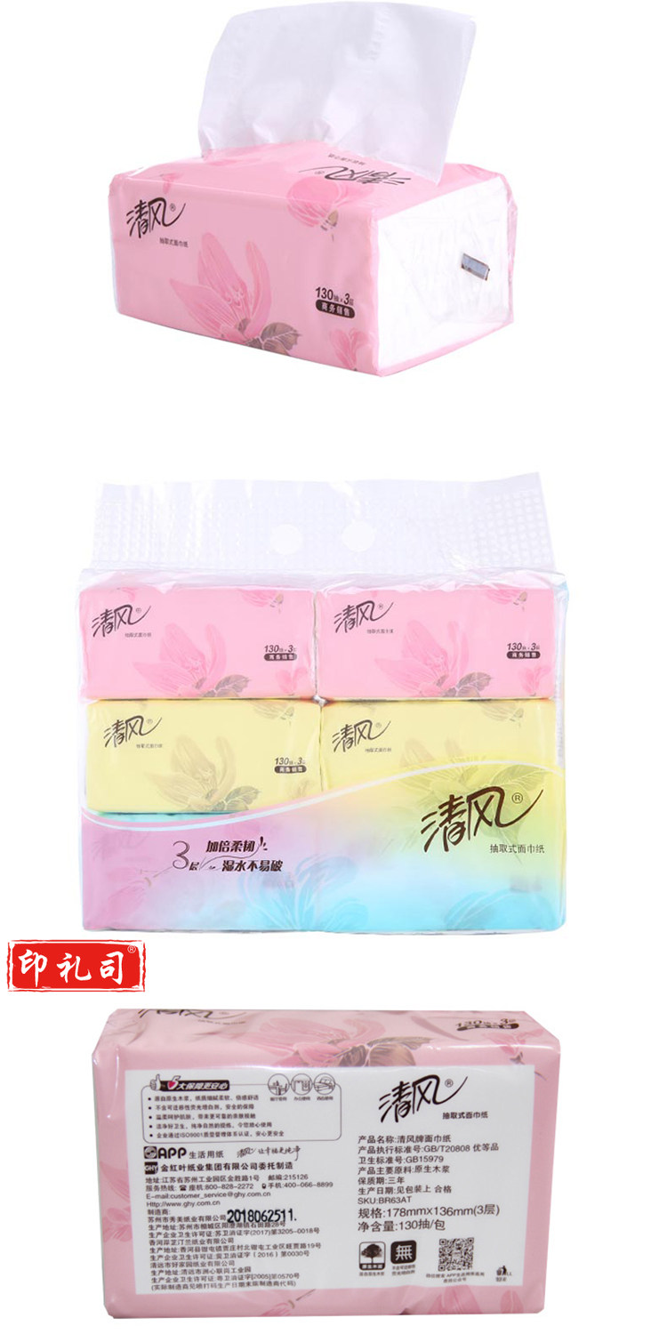 清风 BR63AT 软抽纸130抽 面巾纸抽纸巾6包/提60包/箱