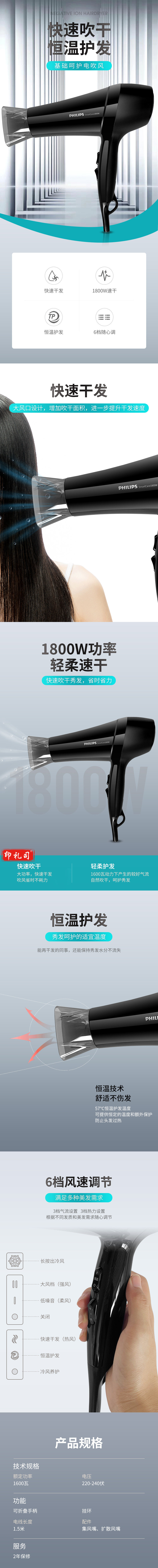 飞利浦 BHC020 吹风机1800W大功率 吹风筒