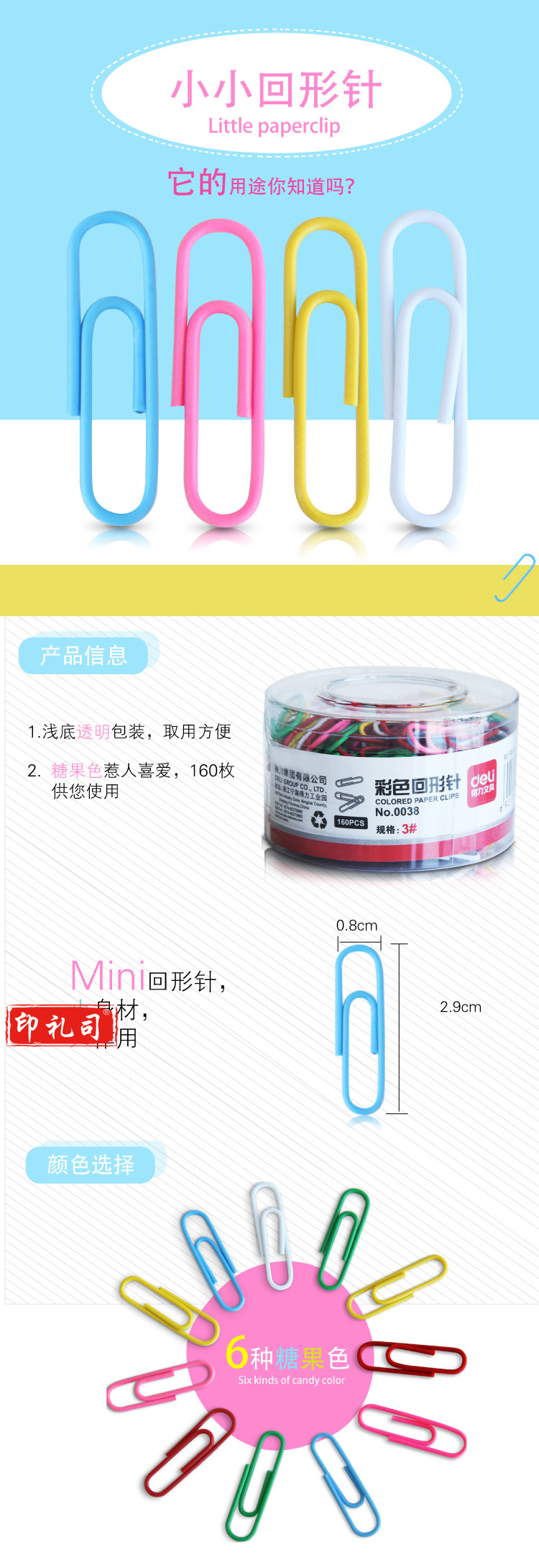 回形针彩色 曲别针 0038 29mm 160枚/筒