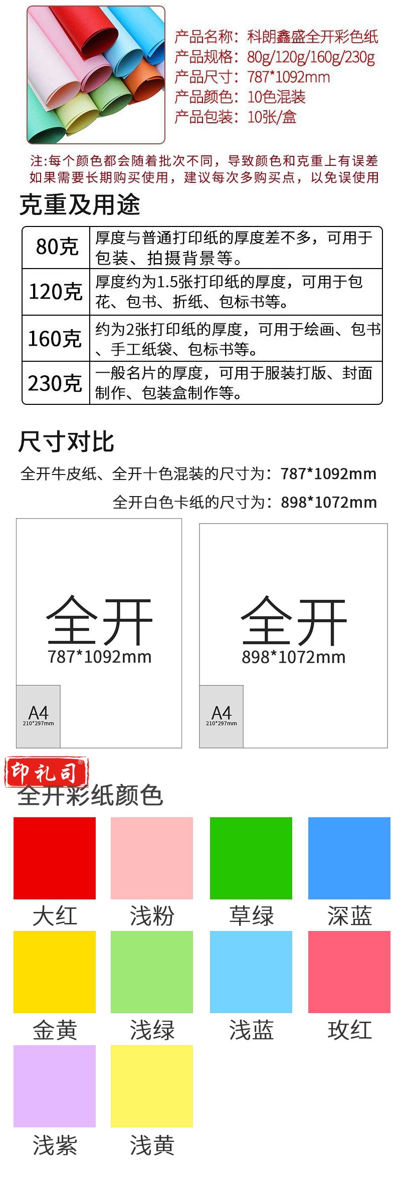 科朗鑫盛 787*1092 大张卡纸彩纸10色混装120g 10张/组