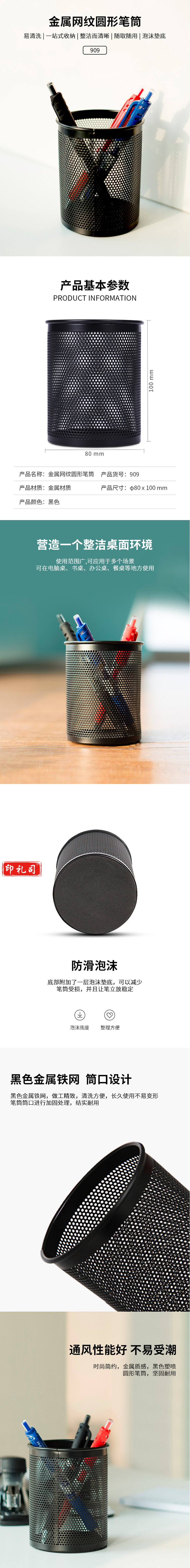 得力909 圆形笔筒80*110mm 桌面收纳盒 金属黑色