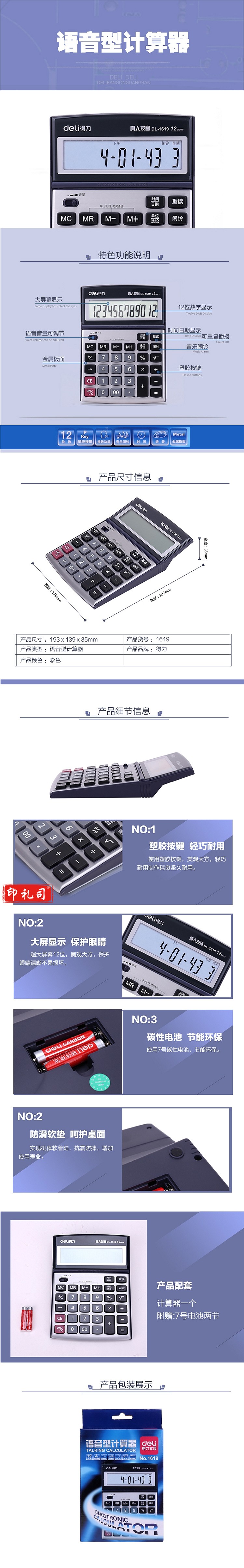 得力 1619 计算器12位大屏语音计算机 可翘头