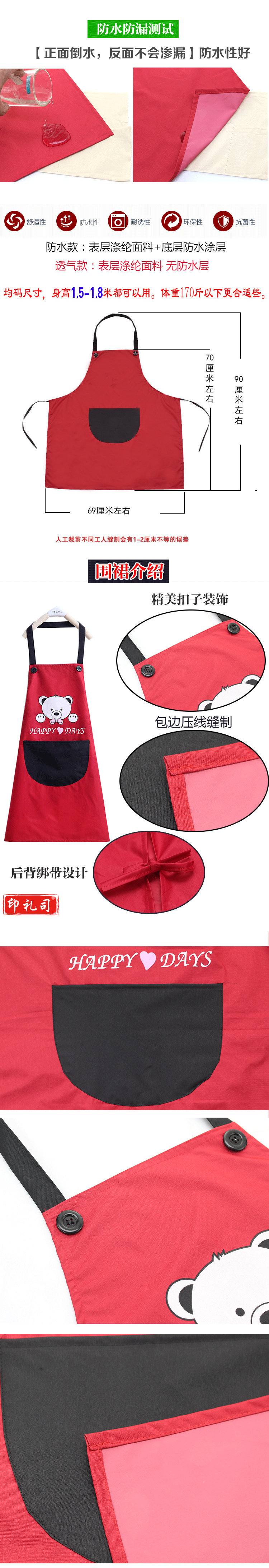防水防油厨房围裙可爱韩版时尚男女成人工作服 尺寸约为69*70*90