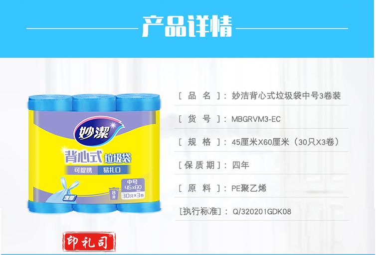 妙洁 背心式垃圾袋中号90只 45cm*60cm