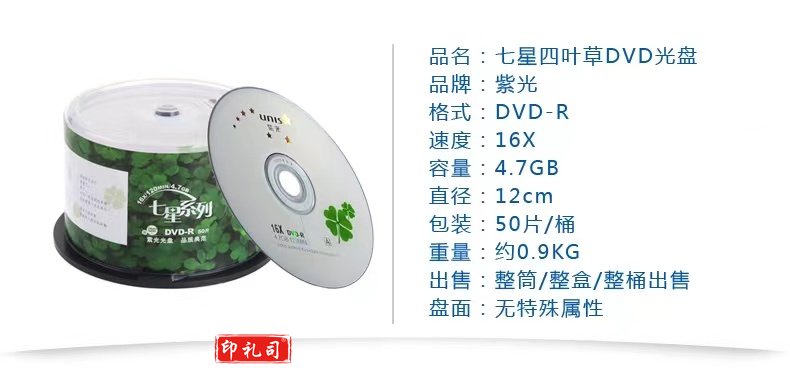 紫光 DVD-R 16速 4.7G 七星四叶草 50片桶装 刻录盘空白光盘