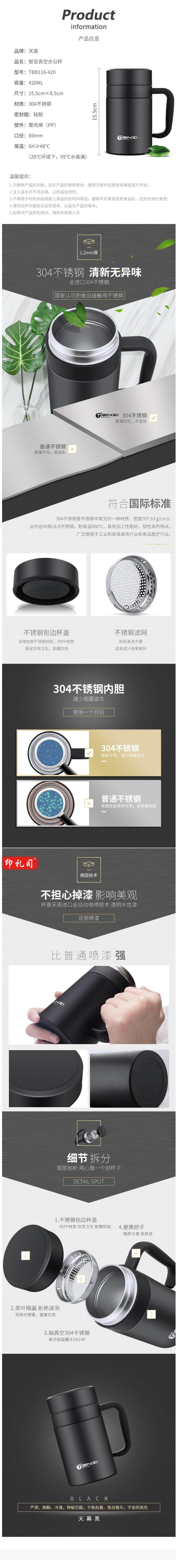 天喜 黑色520ml 保温杯 泡茶杯304不锈钢水杯带把手杯