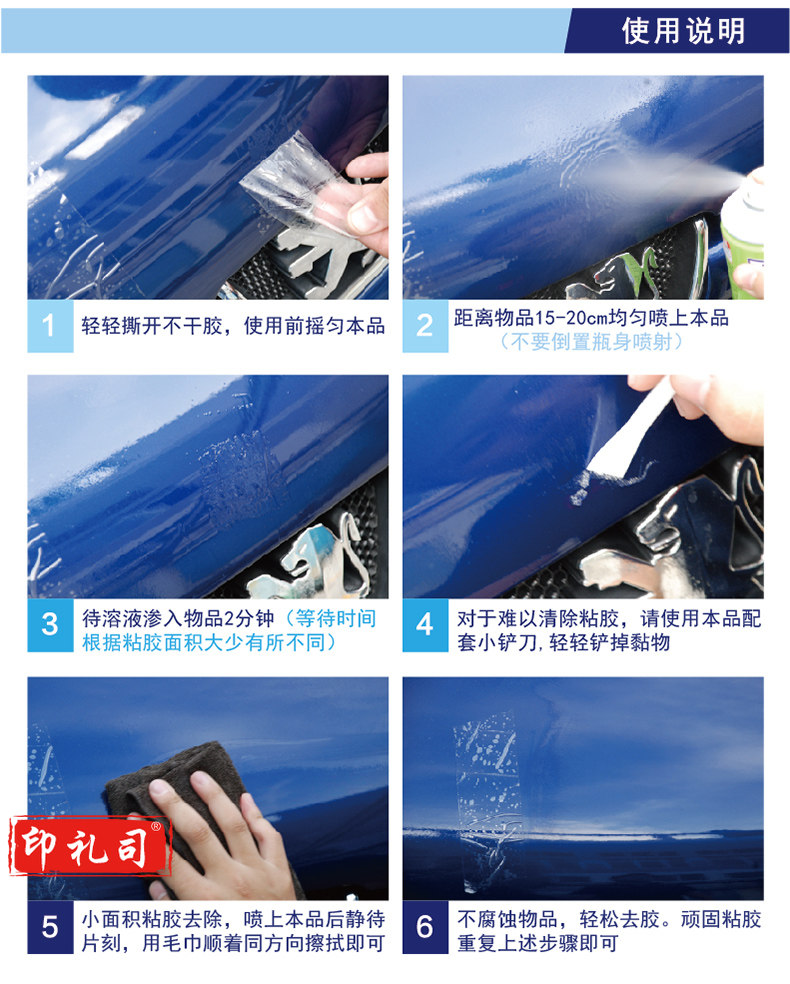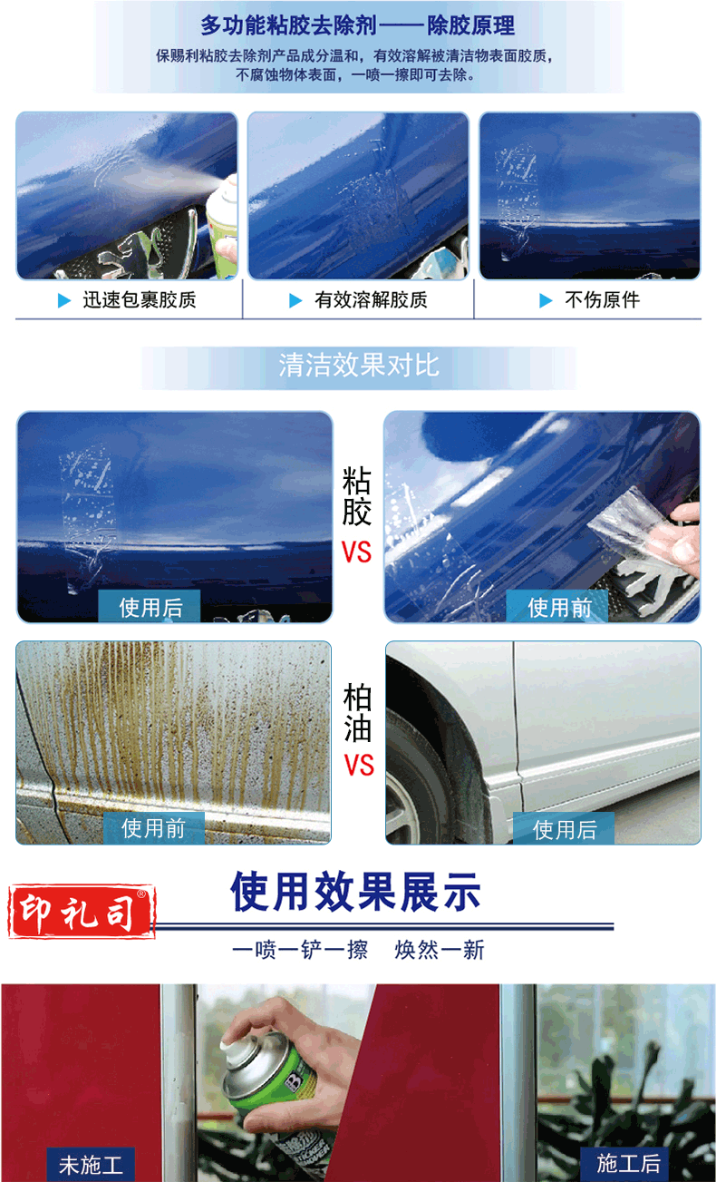 保赐利粘胶去除功能,可将贴在车窗或车身、油漆表面、大理石表面等处的不干胶等粘贴物撕下来,还可将不干胶撕掉后残留下的浆糊物质轻易去除,具有清新香味,一喷一擦,即可轻松去胶。适用于汽车、玻璃、广告牌等有粘贴物的表面,如汽车车身不干胶标签、挡风玻璃粘贴物、路边广告牌粘贴物、电线杆粘贴物等。