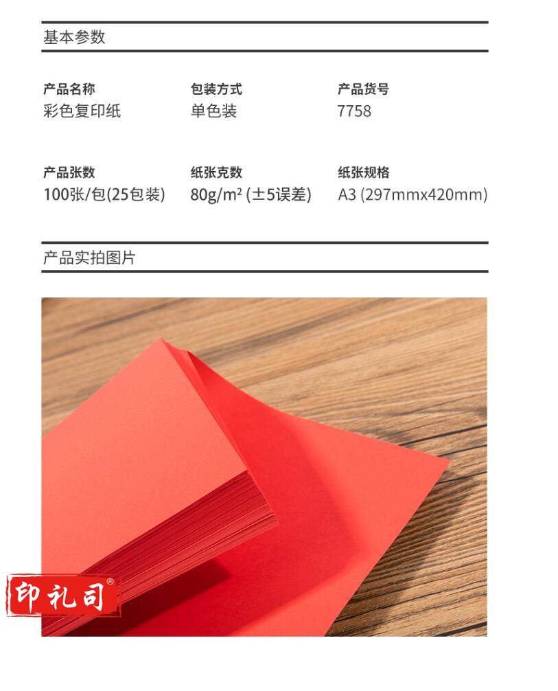 得力 彩色打印纸-A3-80g 浅红色打印纸卡纸 7758 100张/包 25包/箱