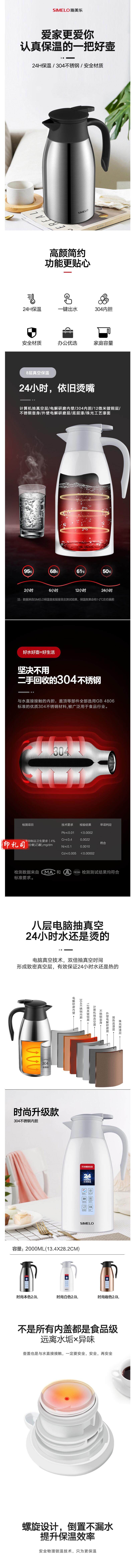 SIMELO 保温壶304不锈钢暖壶热水瓶 2L时尚本色 货号:JC