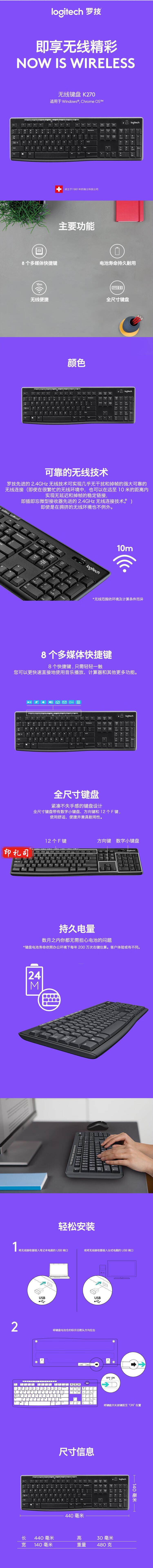 罗技 K270无线键盘办公键盘USB适配器连接 全尺寸108键 黑色