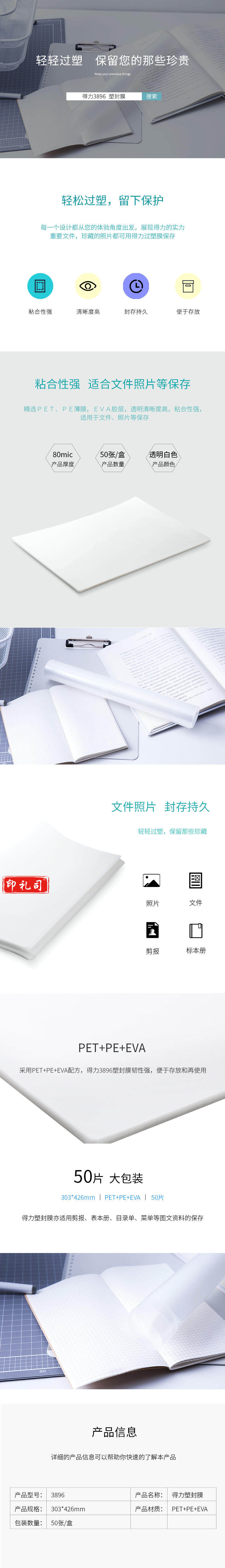 得力 A3塑封膜303*426mm 文件保护膜 50张 3896