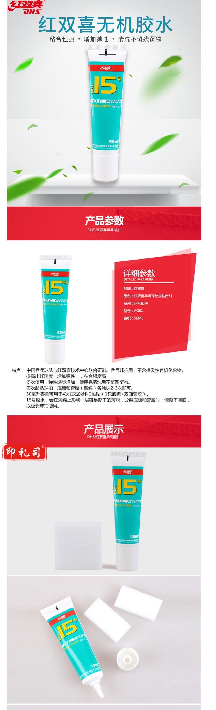 红双喜(DHS)乒乓球拍胶皮专用无机胶水50ML 胶皮打底用水溶性粘合剂 15号无机胶水 206886