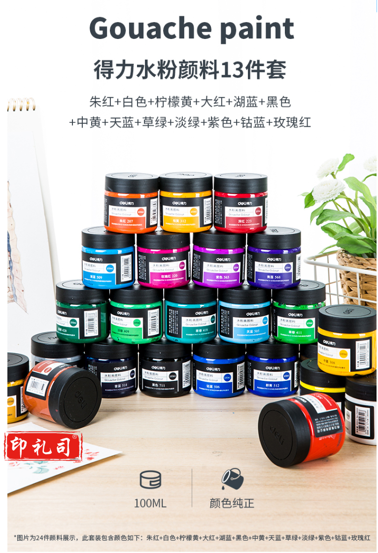 得力(deli)水粉画颜料13色100ml 丙烯画颜料手绘彩绘墙绘画画套装 美术绘画涂鸦防水颜料