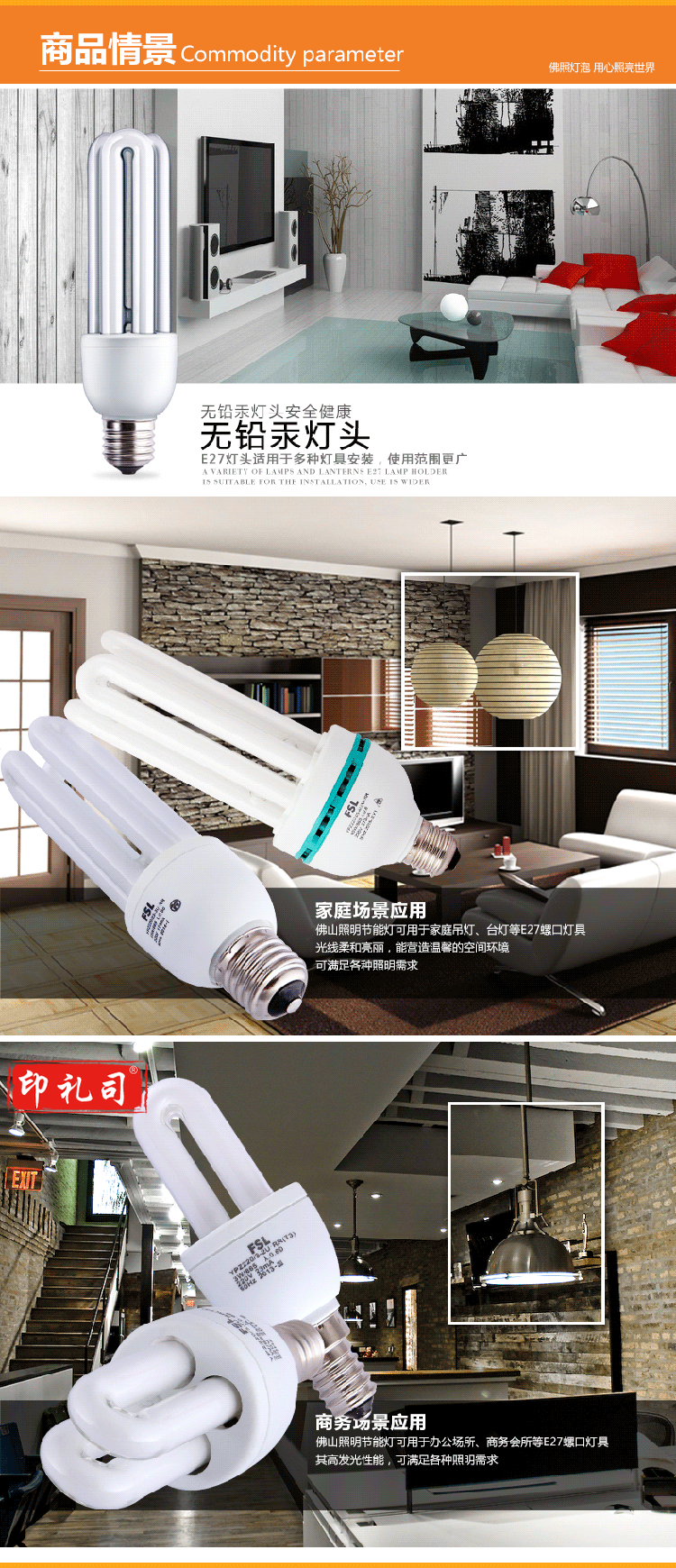 佛山照明 45W节能灯泡4U型三基色荧光E27螺口白光6500K