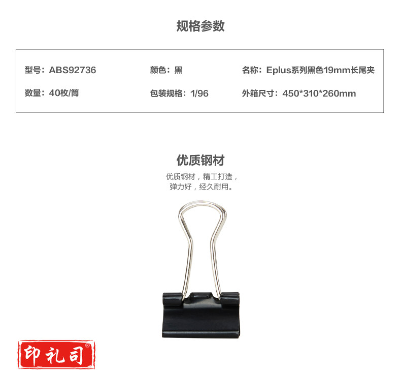 晨光 ABS92736黑色筒装长尾夹 19mm 40个/筒