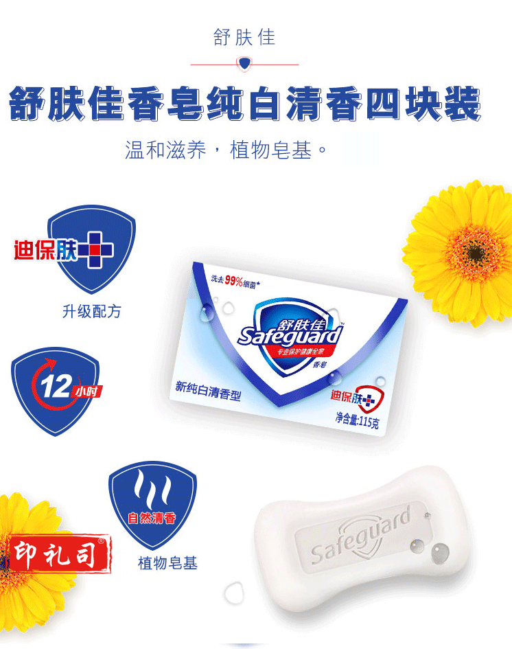 舒肤佳香皂 纯白清香型115g*4块装 家庭优惠装组合装