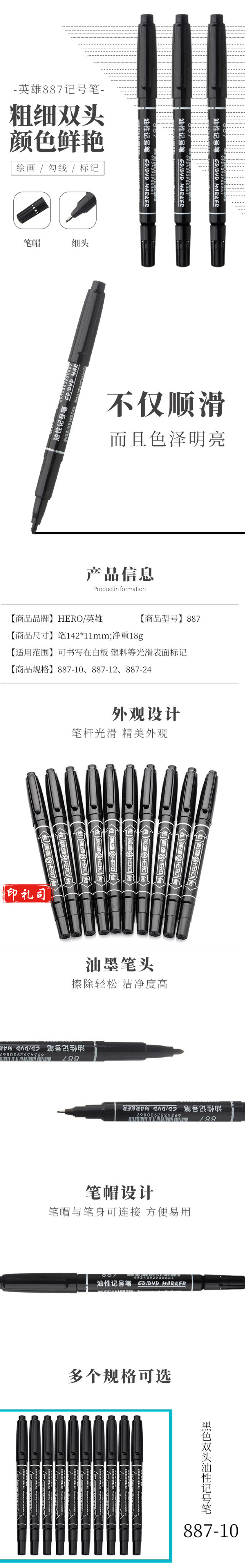 英雄 887 记号笔油性记号笔10支装黑色