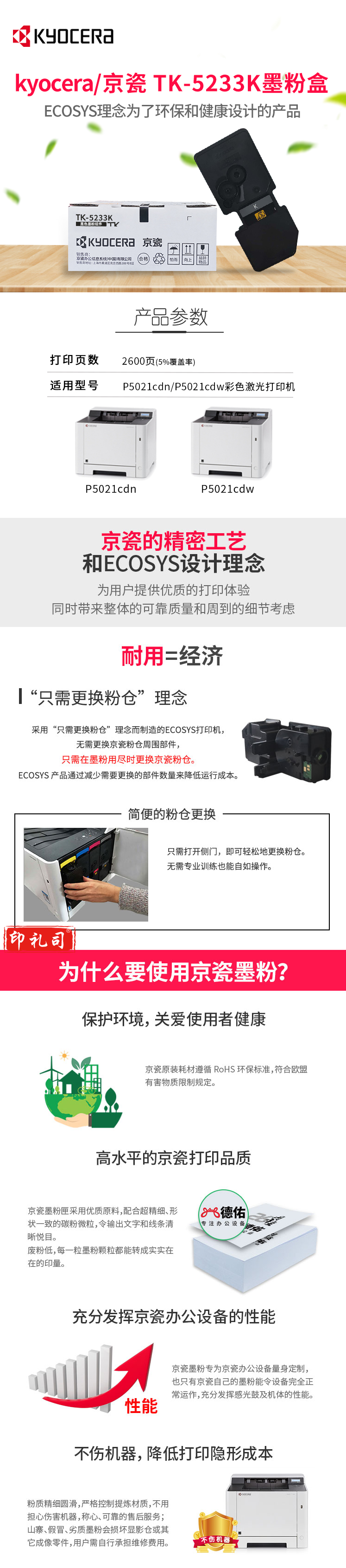 京瓷(Kyocera)TK-5233K 黑色墨粉/墨盒 京瓷P5021cdn/P5021cdw打印机墨粉盒