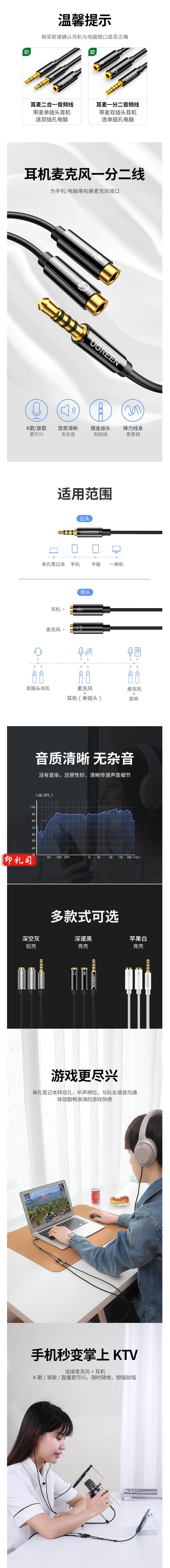 绿联(UGREEN)AV141/30620 耳机麦克风一分二转接线 3.5mm音频线手机耳机二合一
