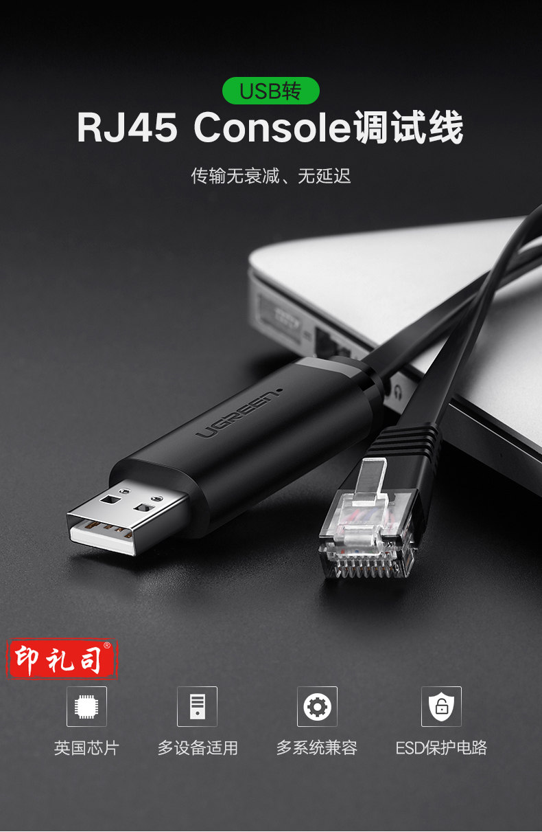 绿联Console调试线USB转RJ45控制线交换机配置线转换线适用思科华为腾达TP-LINK路由器 黑色1.5米 50773