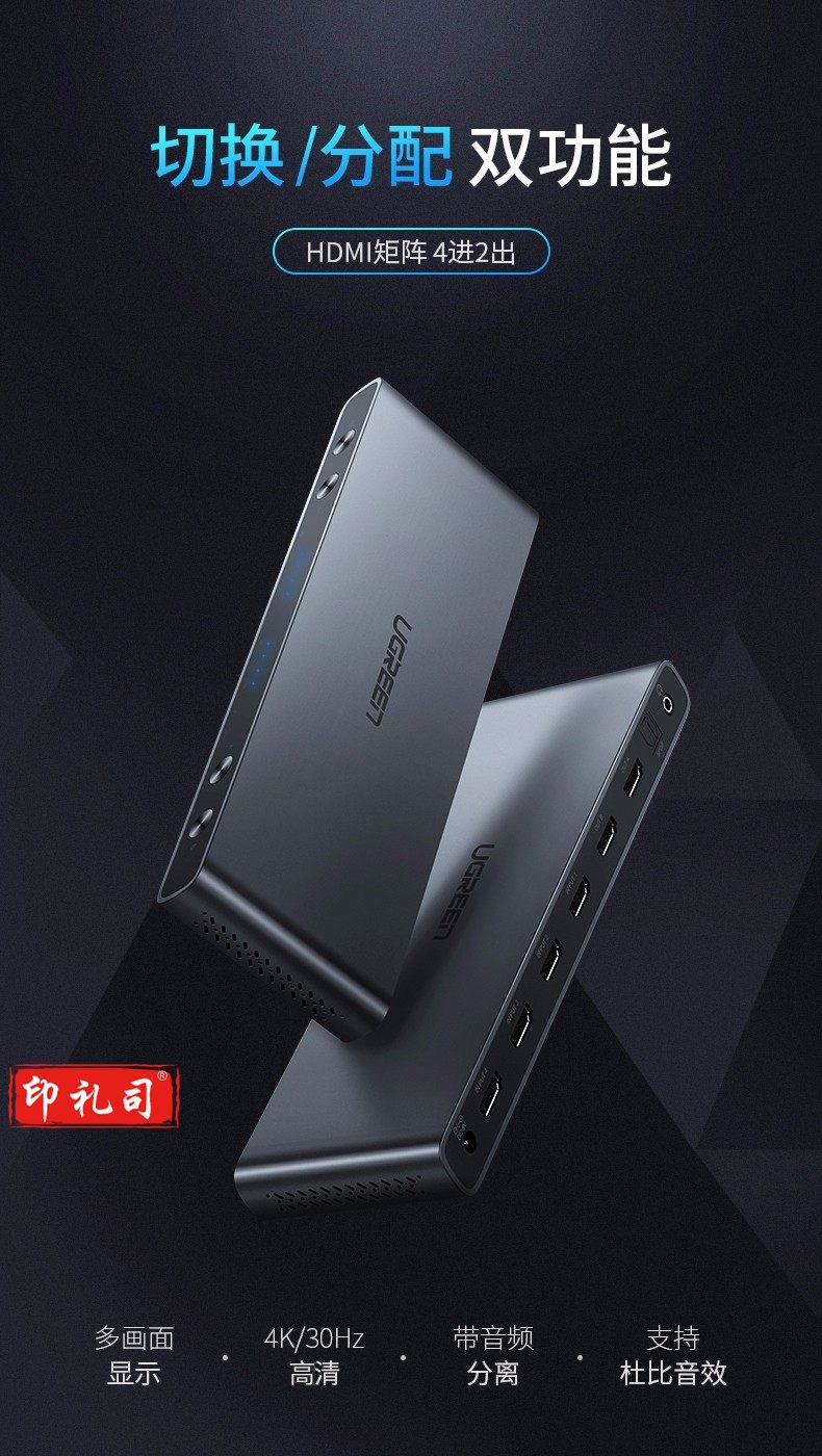 绿联 HDMI矩阵切换器hdmi分配器四进二出 4K高清视频切屏器 笔记本电脑接电视投影仪共享显示器 HDMI分配器 4进2出 40216