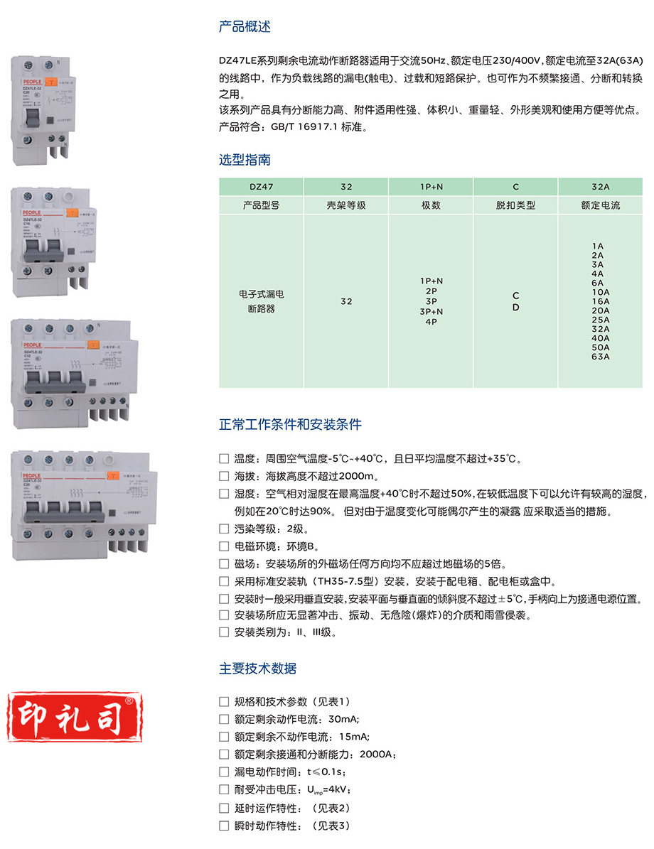 人民电器 DZ47LE-3P10A 4L 漏电保护器