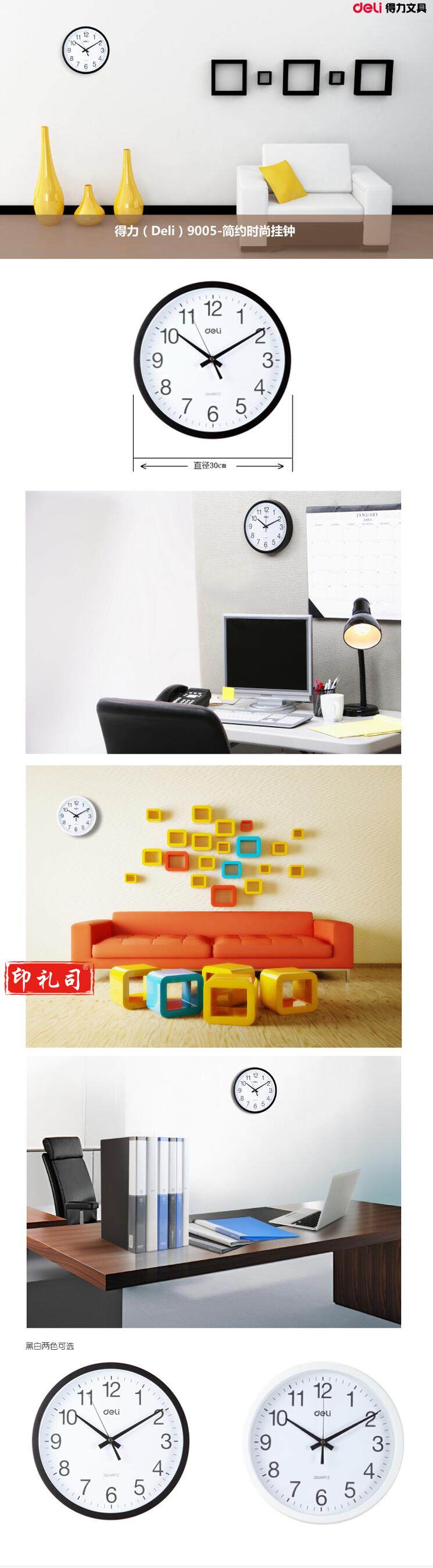 得力 9005 挂钟钟表 30cm挂钟 客厅挂式无噪音钟表 白色
