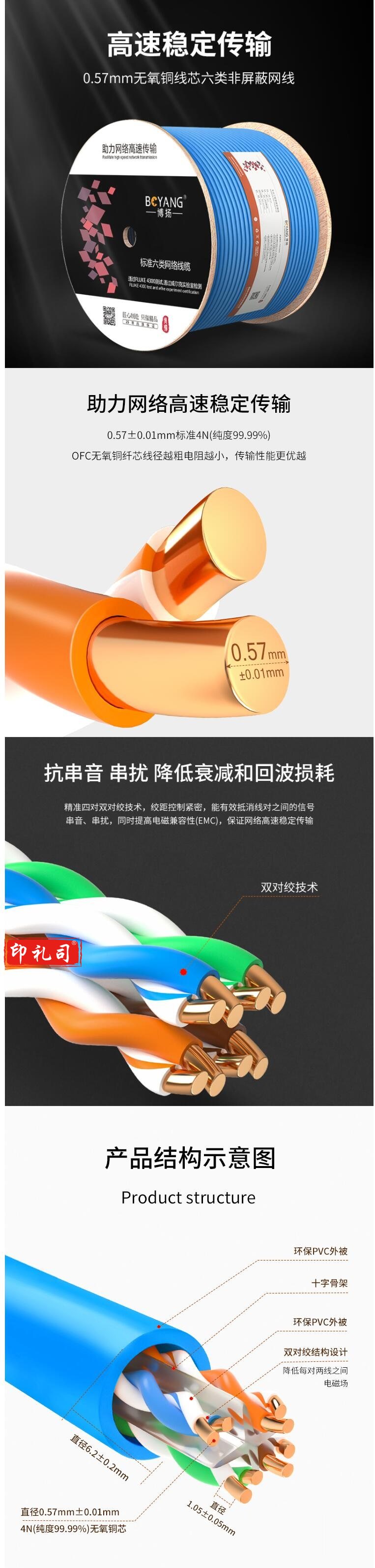 博扬 黄色BY-6305Q 六类网线箱线0.57mm无氧铜线芯室内非屏蔽4对双绞线 CAT6类标准POE供电监控工程线 305米