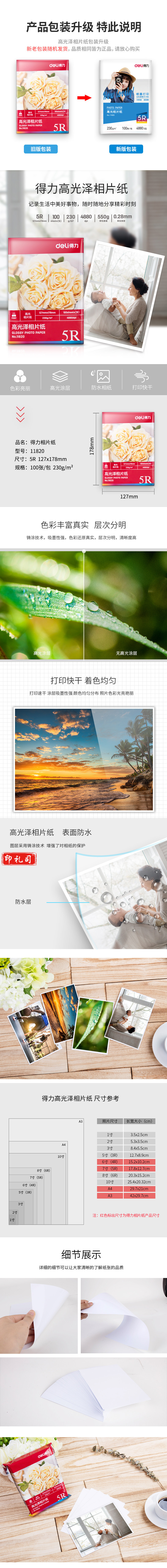 得力11820 高光相片纸-5R-230g/㎡ 7寸(白)(100张/袋