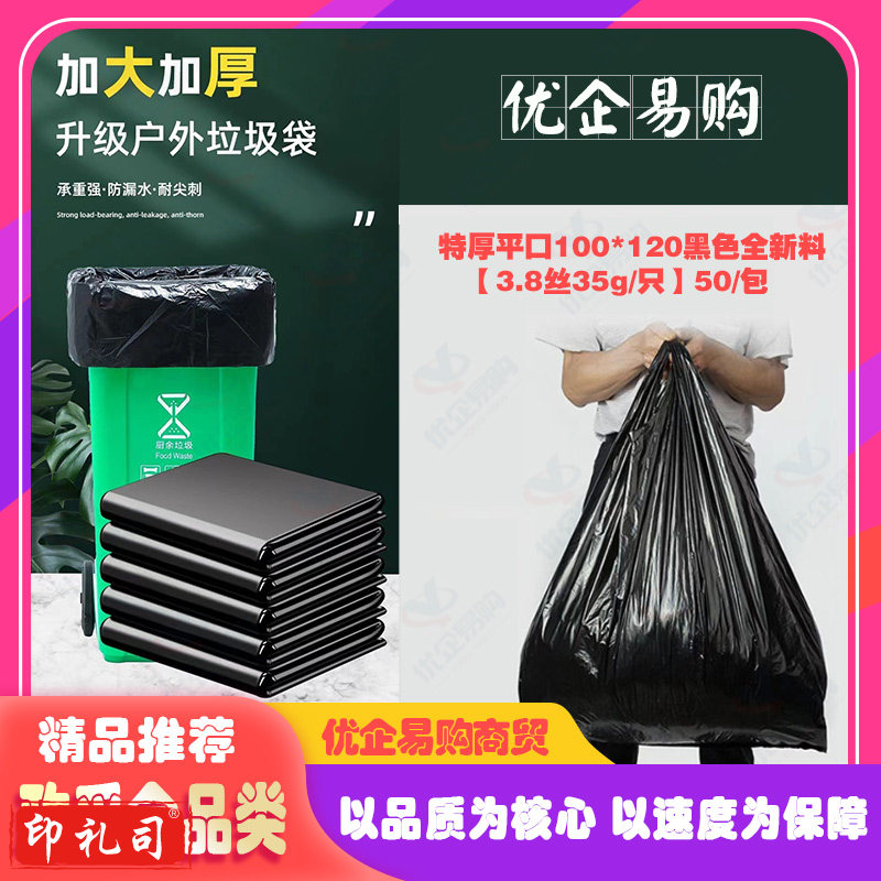特厚平口100*120【3.8丝35g/只】50/包黑色全新料 黑色大号平口大垃圾袋加厚加黑商用物业环保酒店塑料袋