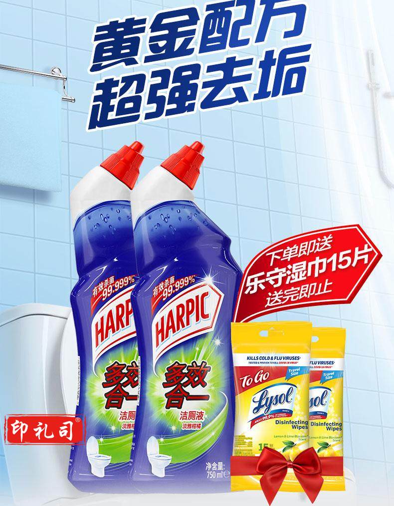 亮湃HARPIC洁厕液淡雅柑橘750ml*2+乐守Lysol湿巾15片*2 马桶清洁剂强力去污去垢除垢除菌去味默认规格