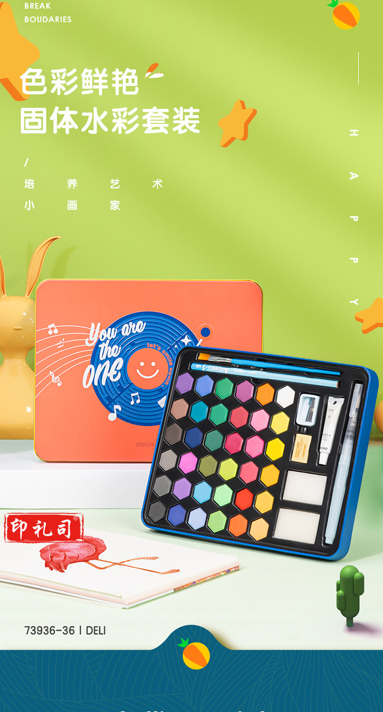 得力(deli)源源得力固体水彩36色水彩颜料套装含画笔自来水笔铅笔橡皮擦 73936-36