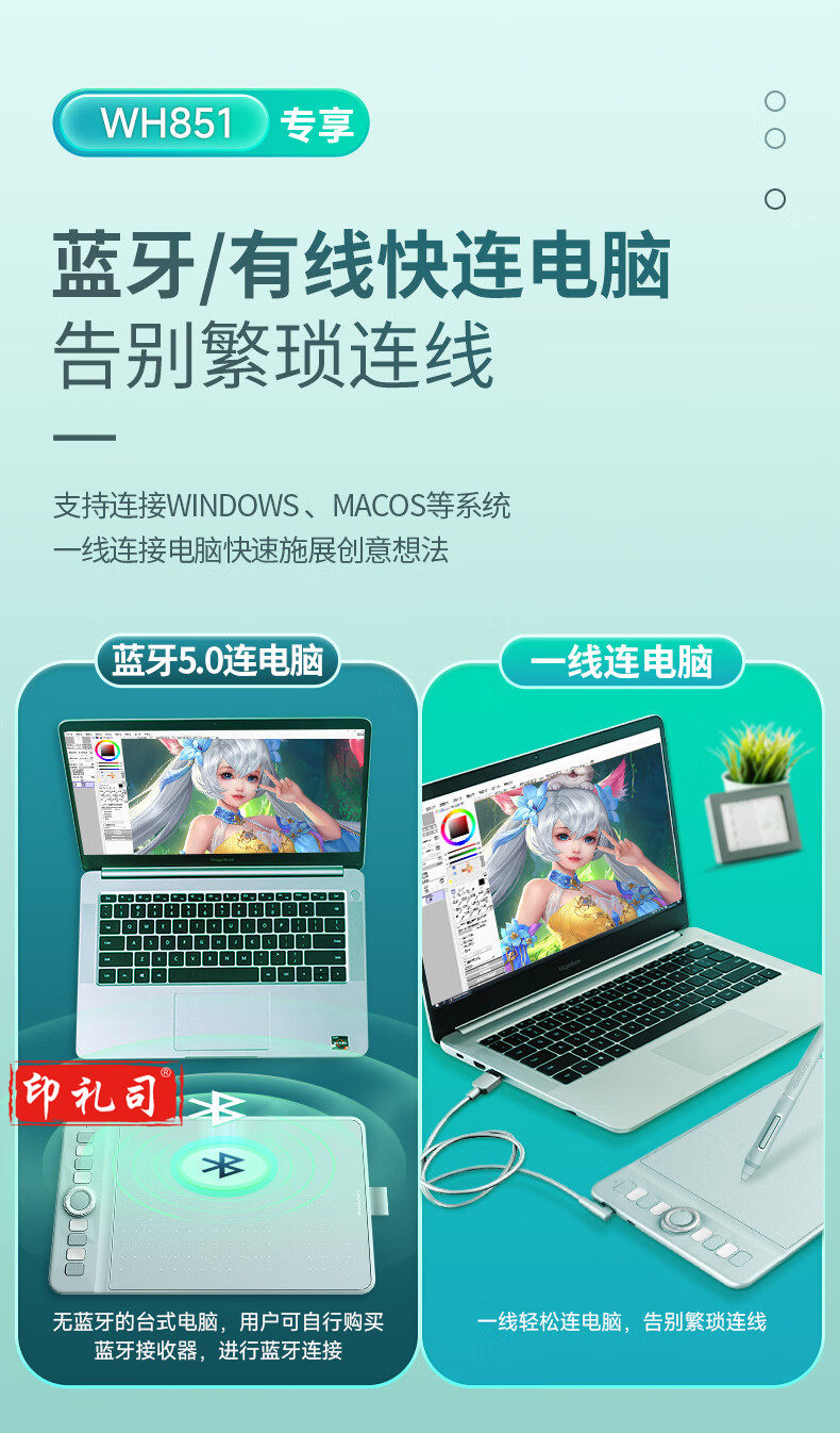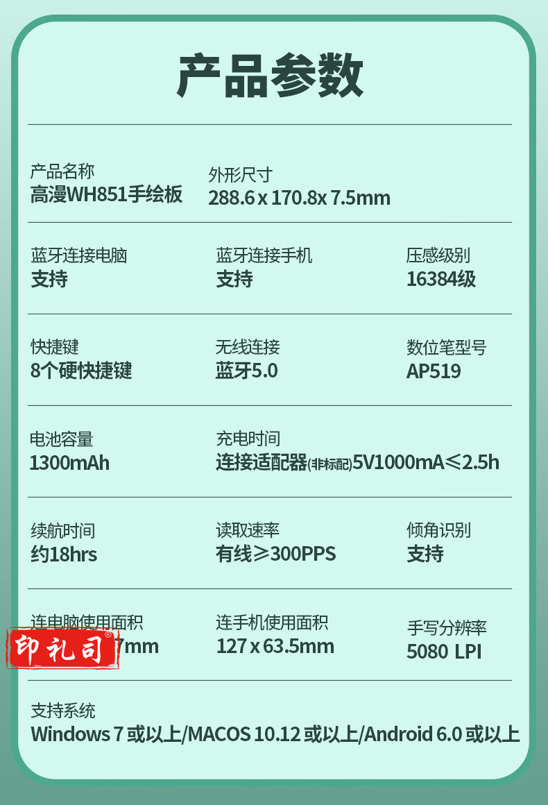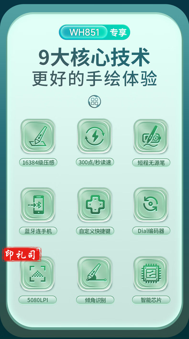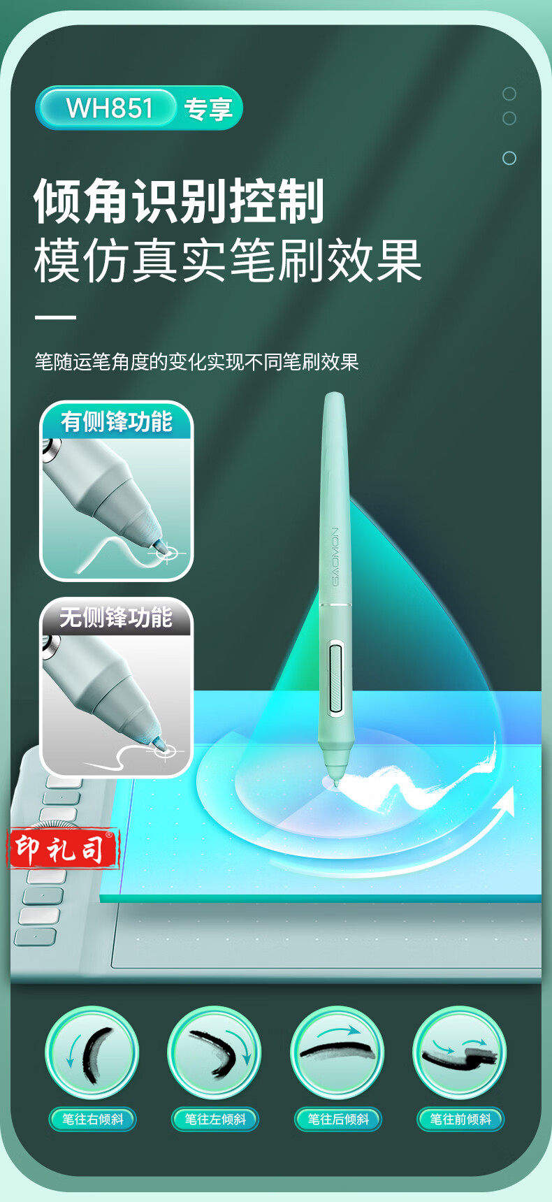 高漫(GAOMON)WH851 新款蓝牙无线手绘板 短程无源笔手写 16K级压感数位板 可连手机 清新绿