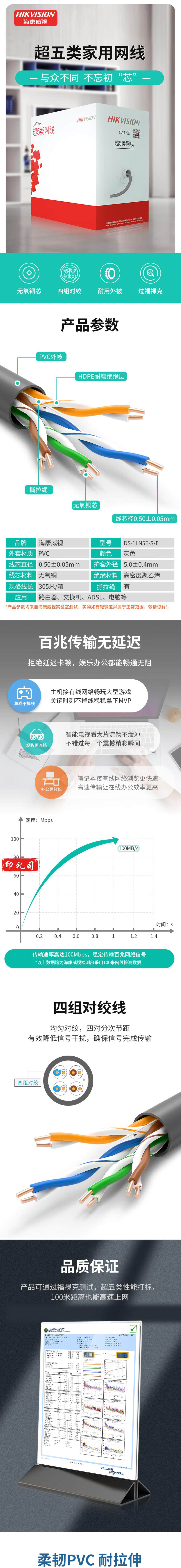 海康威视 DS-1LN5E-S/E 监控原装超5类网线 非屏蔽双绞线 超五类 0.5芯 305米/箱