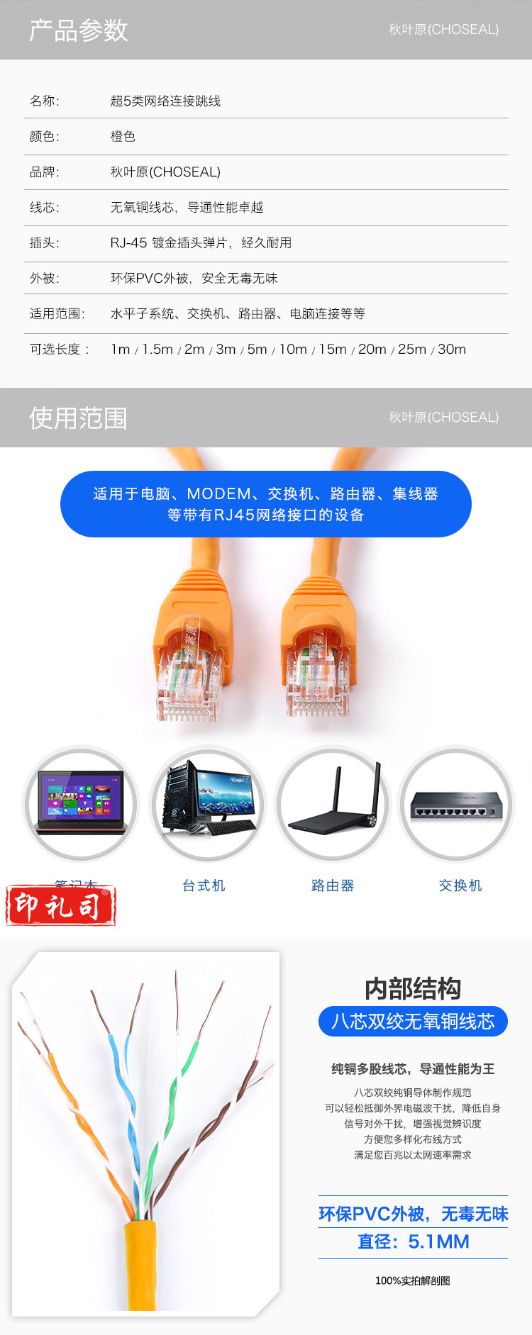 秋叶原(CHOSEAL)高速超五类网线 网络线连接线 带水晶头网络跳线 8米
