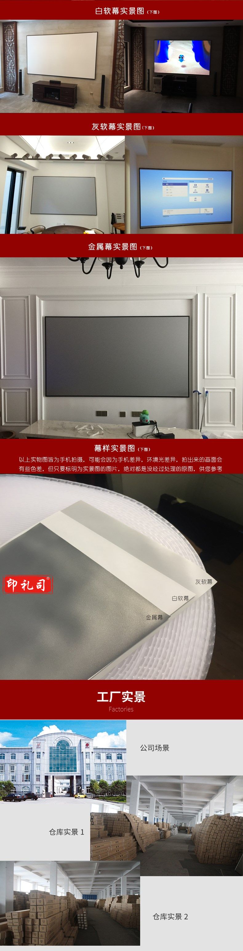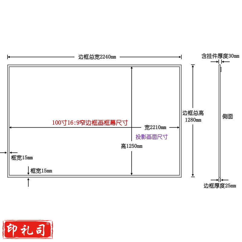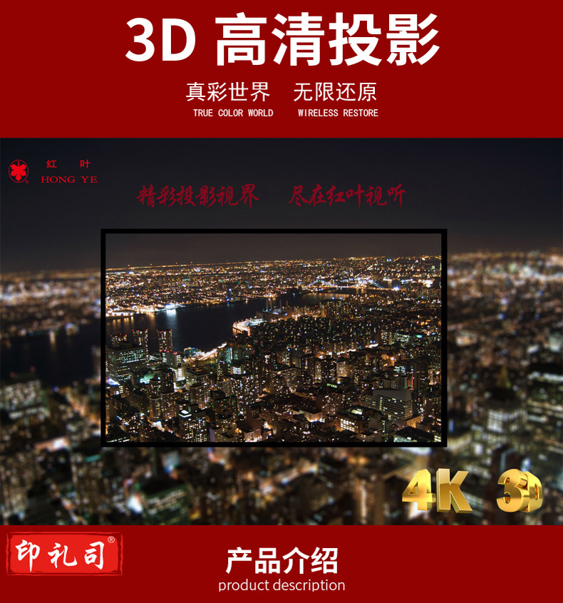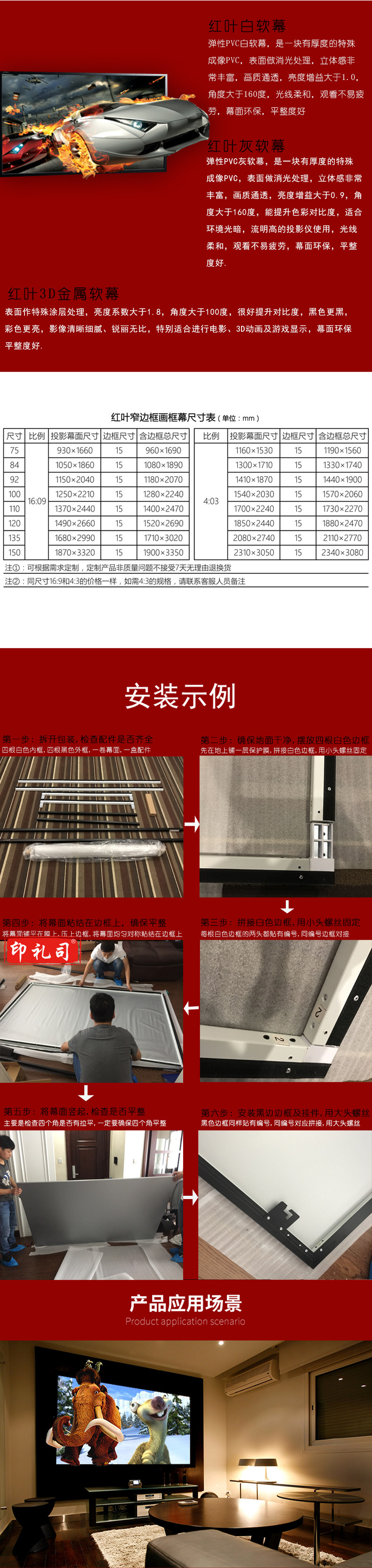 红叶(HONGYE)窄边框100寸16:9纳米高清4K&3D白软幕灰幕金属幕影院画框幕 2.21*1.25