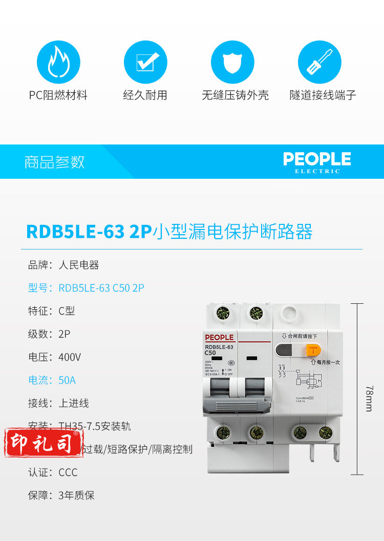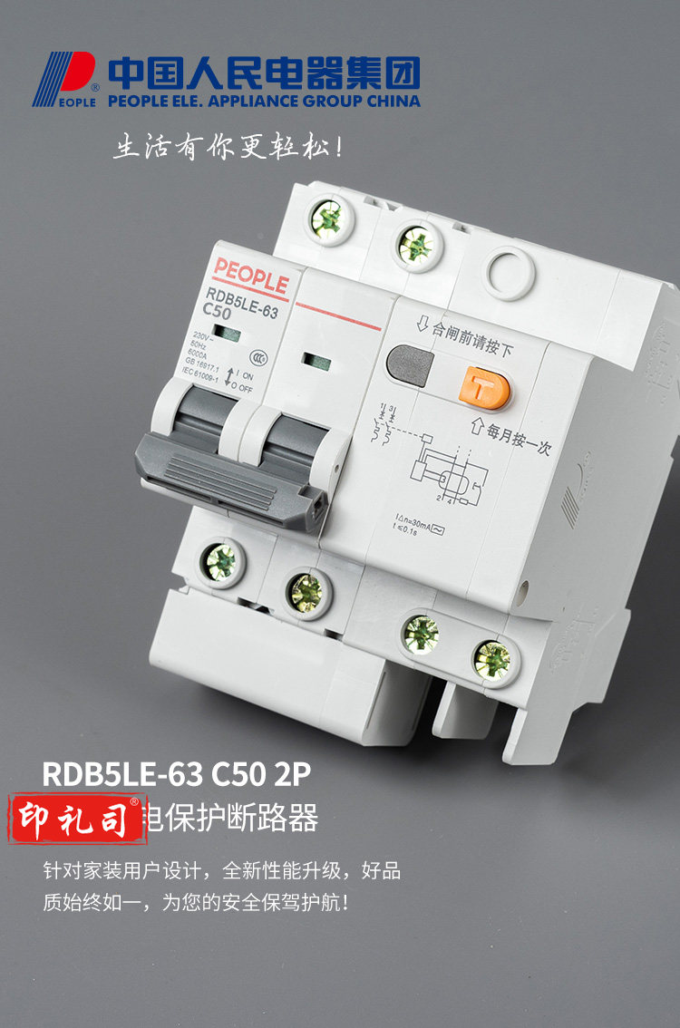 人民电器(PEOPLE) RDB5LE-63漏电保护器 DZ47 2P10-63A