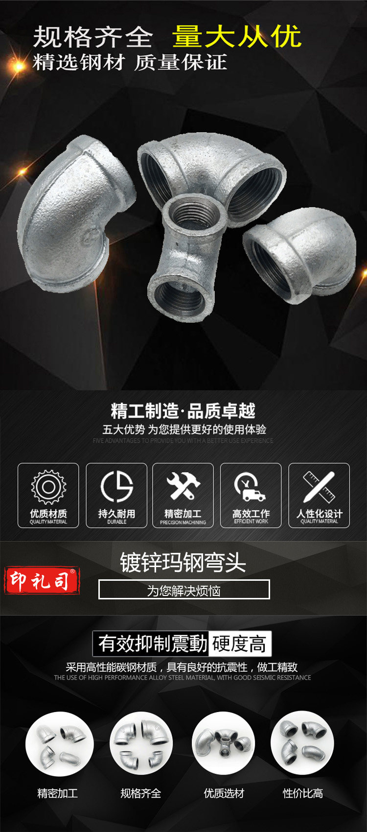 加厚镀锌内丝弯头 螺纹弯头自来水管接头40*15 100个/包