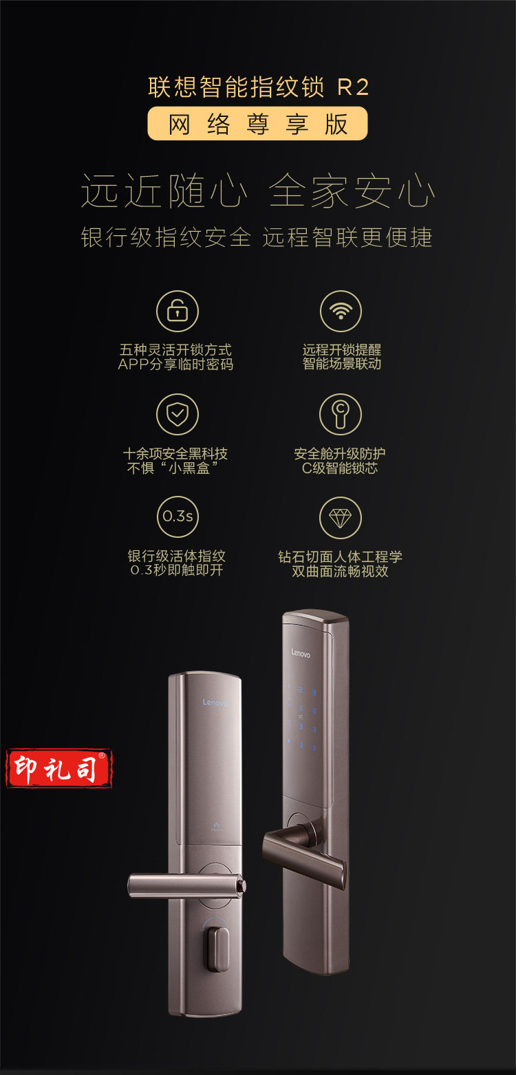 联想 Lenovo R2网络尊享版 指纹锁智能锁电子锁密码锁智能门锁家用防盗门支持无线wifi C级锁芯 星空黑