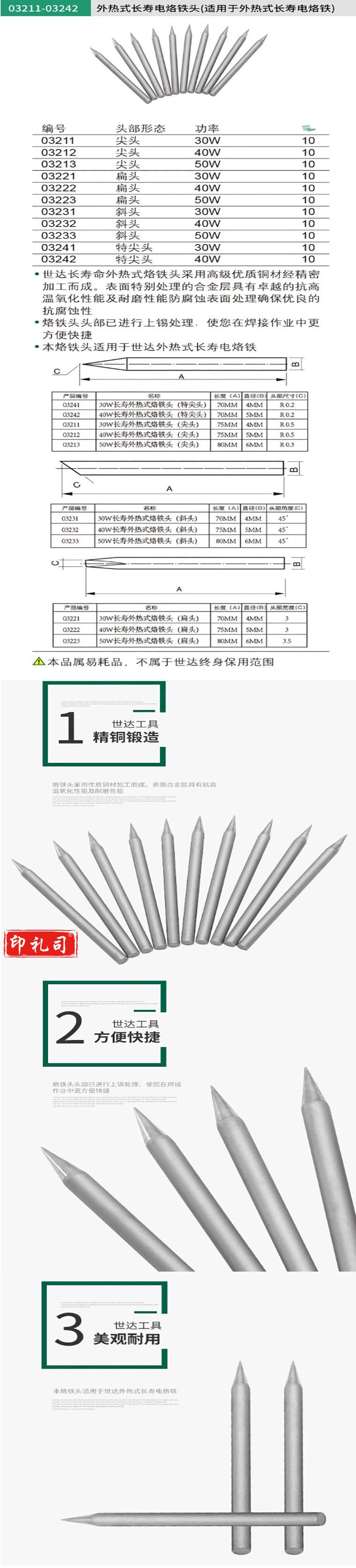 世达 03232 40瓦外热式长寿烙铁头 斜头 计价单位:支