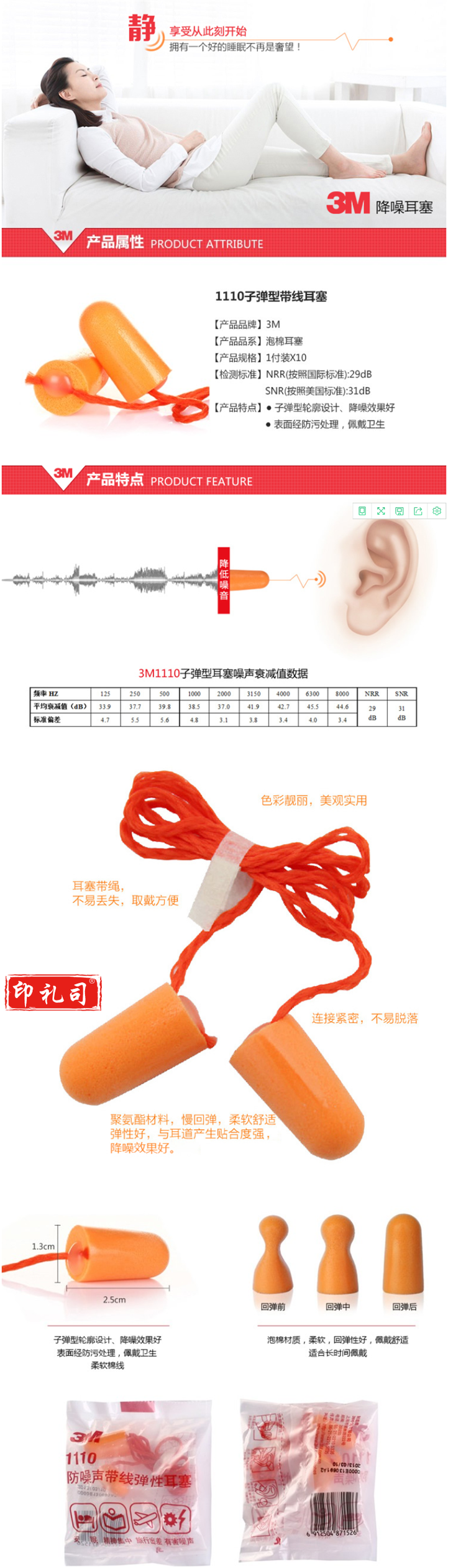 3M 1110(带线) 耳塞抗噪 防噪音 睡眠隔音耳塞(100付/盒)
