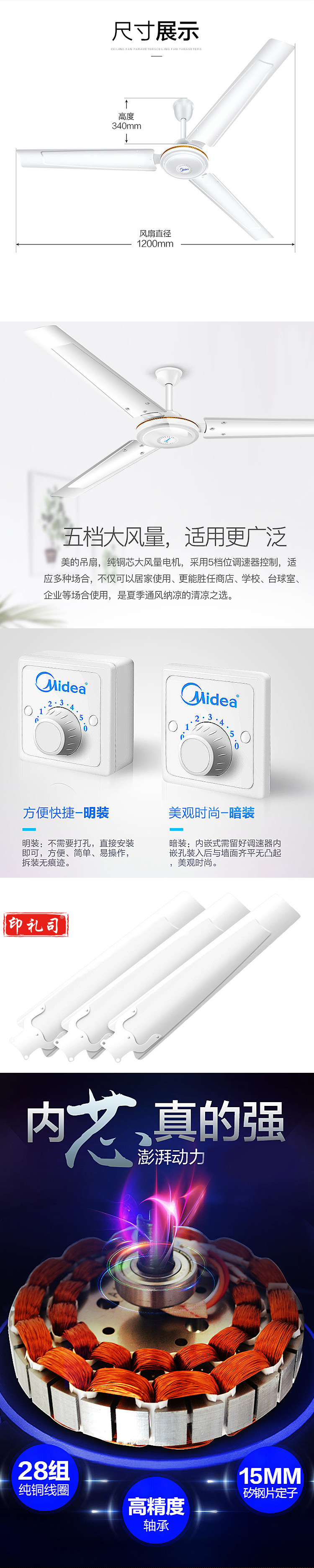 美的(Midea) FC120-BA 吸顶吊扇 5档 直径1200mm (含安装)