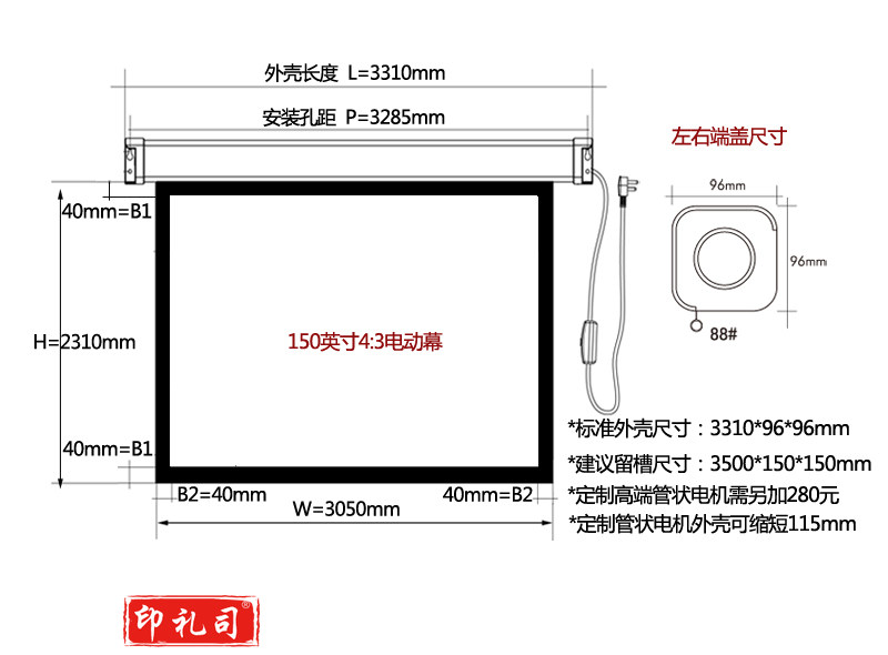 红叶(HONGYE)电动投影幕布150寸4:3白塑幕玻珠幕白玻纤高清幕布 3.05*2.30