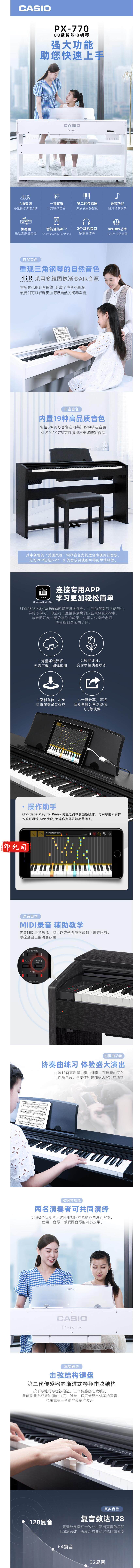 卡西欧(CASIO)PX-770WE 电钢琴 88键重锤数码钢琴 带盖家居立式