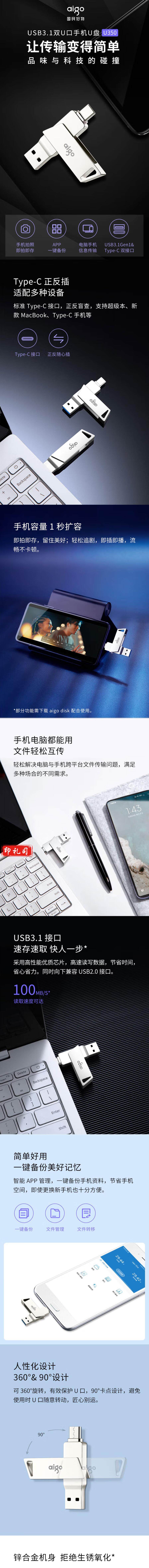 爱国者 256GB Type-C USB3.1 手机U盘 U350 银色 双接口手机电脑两用