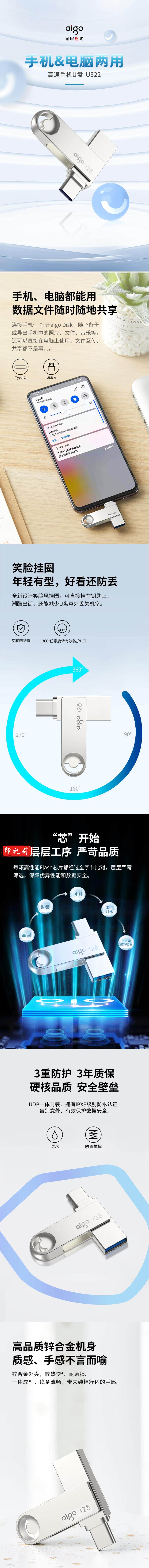 爱国者64GB Type-C USB3.2 手机U盘 U322 银色 读速180MB/s 双接口手机电脑用